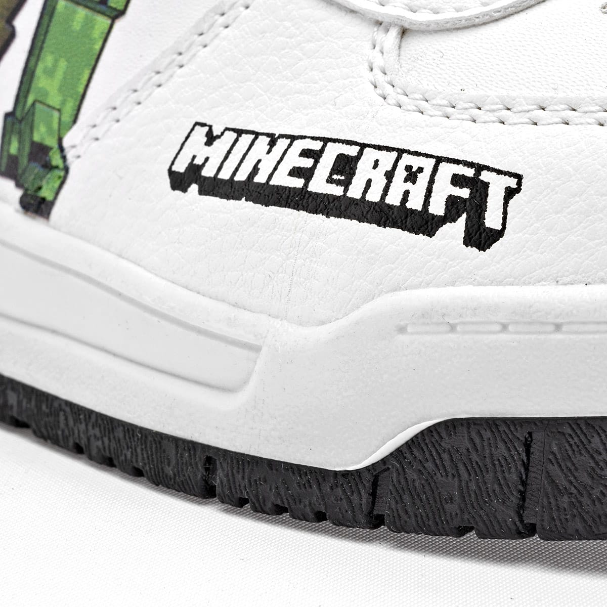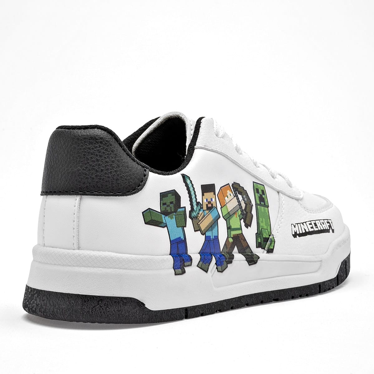 En el lateral tienen un estampado de los personajes principales del juego en un estilo dinámico y el logotipo de "MINECRAFT".